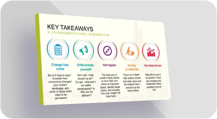 KEY TAKEAWAYS IF YOU REMEMBER NOTHING –REMEMBER THIS: Change has Differentiate Hot topics Quality Get data-driven come yourself & shelf-life But is it here to stay? Don’t ask: ‘what The best sort of Focus on in-depth, Data allows you to Consider how should we do?’ content helps clients high quality content be dynamic. Feed coronavirus changed Do ask: ‘what aren’t to form their own that adds value over your strategy and your content our peers views on important the medium term – streamline where landscape, and doing/saying?’ or topics. Identify these and let it do the possible to prove which of these shifts ‘Why are we topics, and consider heavy lifting! ROI need to be different?’ how your insight will permanent help theirs